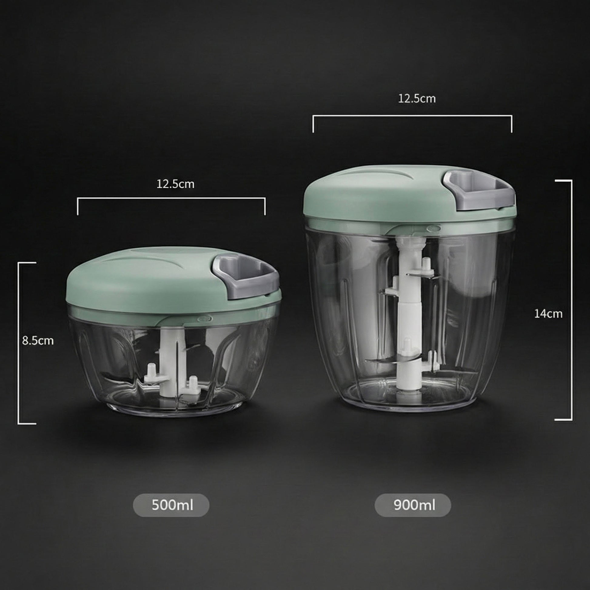 The 900ml version is 14 cm tall, still compact enough to store neatly while offering extra capacity for bigger prep jobs.